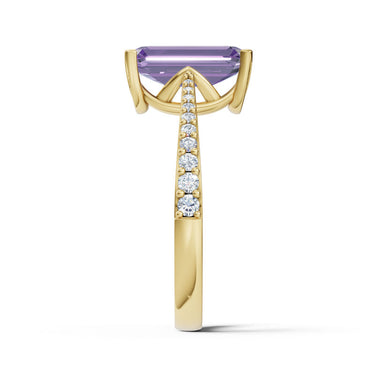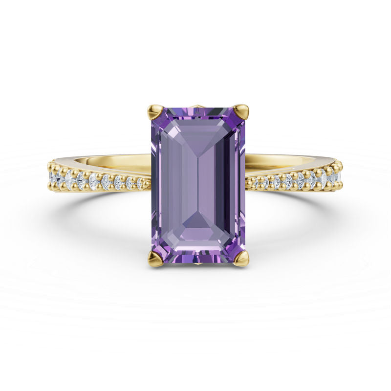Moderní a sofistikovaný prsten ze 14 karátového žlutého zlata zaujme výrazným středovým ametystem v elegantním emeraldovém brusu, který je harmonicky doplněn postranními diamanty v kvalitě SI1, barvy G s excelentním brusem. Celková hmotnost kamenů je 2.912 ct dodává šperku výrazný třpyt a luxusní charakter, který přitahuje pozornost, ale stále působí jemně a vkusně. Tento prsten je dokonalým doplňkem pro ženy, které milují styl, eleganci a současné trendy. Samozřejmostí je luxusní dárková krabička a certifikát pravosti.