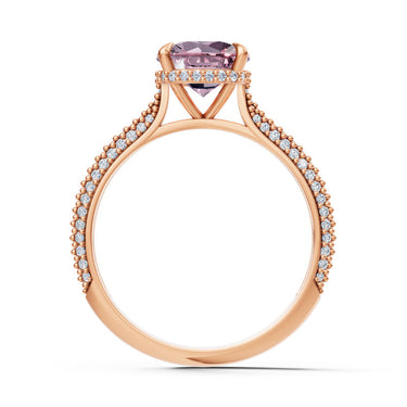 Moderní a sofistikovaný prsten ze 14 karátového růžového zlata okouzlí středovým spinelem v cushion brusu, který je elegantně doplněn postranními diamanty kvality SI1, barvy G s excelentním brusem. Celková hmotnost kamenů 2.73 ct dodává šperku výrazný třpyt a luxusní charakter, který upoutá pozornost, aniž by působil těžce. Lesklý povrch zvýrazňuje čisté linie designu a krásu drahokamů, díky čemuž prsten působí lehce a elegantně. Uložen v luxusní dárkové krabičce a s certifikátem pravosti, je perfektní volbou pro ženy, které chtějí kombinovat styl, jemnost a nadčasový šarm.