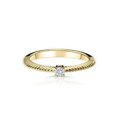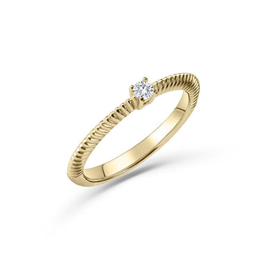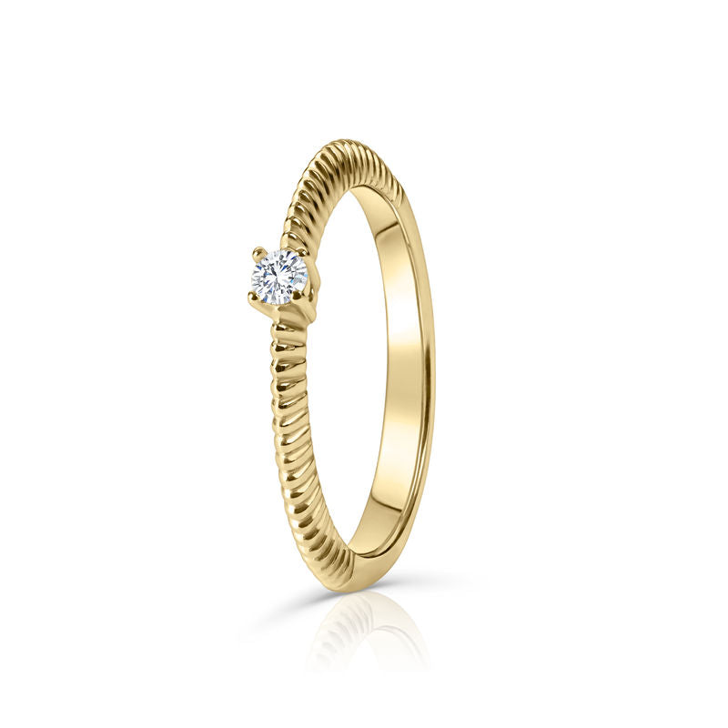 Elegancia a zmyselnosť. Tomuto prsteňu dominuje iskrivý diamant s celkovou hmotnosťou 0,055 ct, ktorý je zasadený do originálneho okrúhleho rámu zo 14-karátového žltého zlata. Šperk sa dodáva v luxusnej krabičke spolu s certifikátom pravosti.