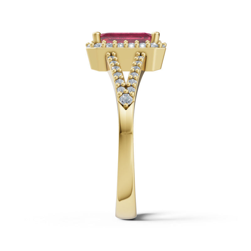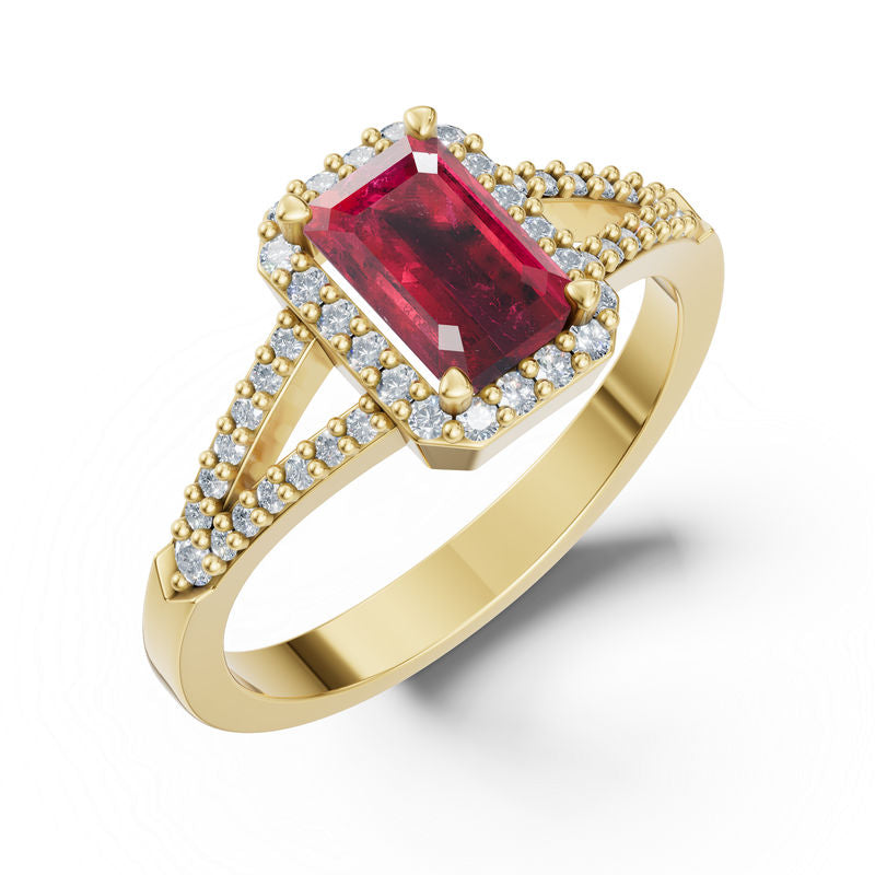 Luxusní a výrazný prsten ze 14 karátového žlutého zlata představuje dokonalé spojení moderního designu a klasické elegance. Středovému rubínu v elegantním emeraldovém brusu dominuje hluboká, sytě červená barva, která prstenu propůjčuje nezaměnitelný charakter. Rubín je harmonicky doplněn jemnými postranními diamanty kvality SI1, barvy G s excelentním brusem, jež šperku dodávají oslnivý třpyt a punc skutečného luxusu. Celková hmotnost kamenů 1.59 ct podtrhuje jeho výjimečnost a výraznou estetiku.