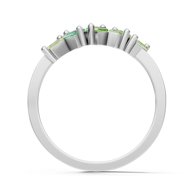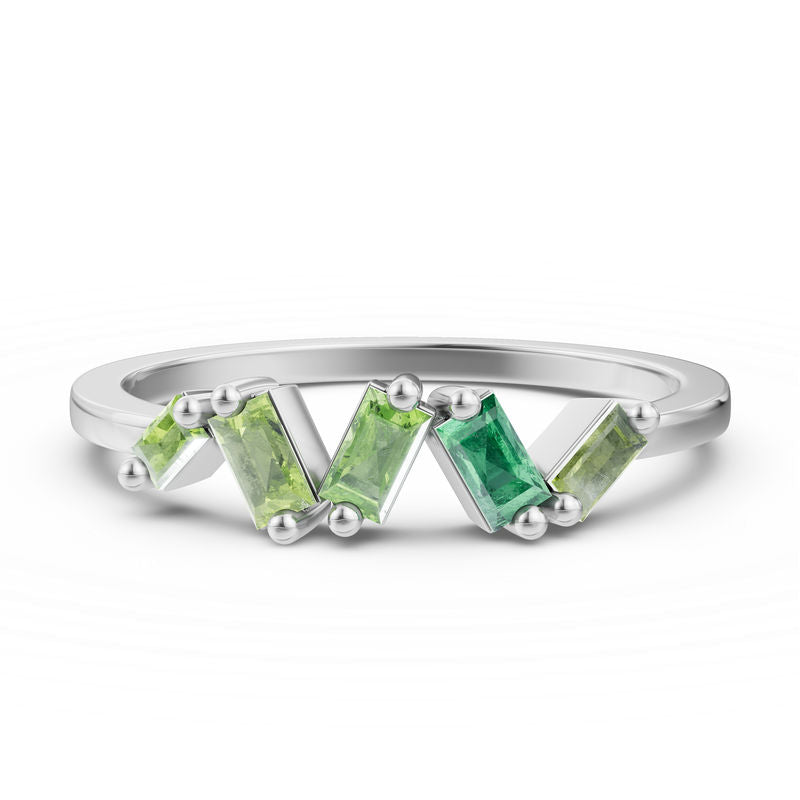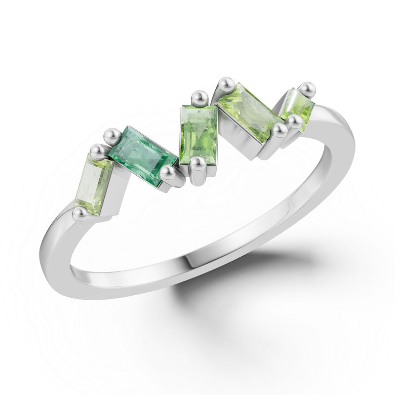 Nadčasový a luxusní prsten ze 14 karátového bílého zlata spojuje moderní design s klasickou elegancí. Šperk je zdoben pěti zelenými safíry bagetového brusu, které dodávají prstenu sofistikovaný třpyt a výrazný luxusní charakter. Celková hmotnost kamenů 0.590 ct podtrhuje jeho výjimečnost a činí z něj skutečně poutavý doplněk. Lesklý povrch a čisté linie designu zvýrazňují precizní zpracování a krásu drahokamů, díky čemuž prsten působí lehce, elegantně a nadčasově. Uložen v luxusní dárkové krabičce a doplněn certifikátem pravosti, je ideální volbou pro ženy, které chtějí kombinovat styl, jemnost a sofistikovaný šarm.