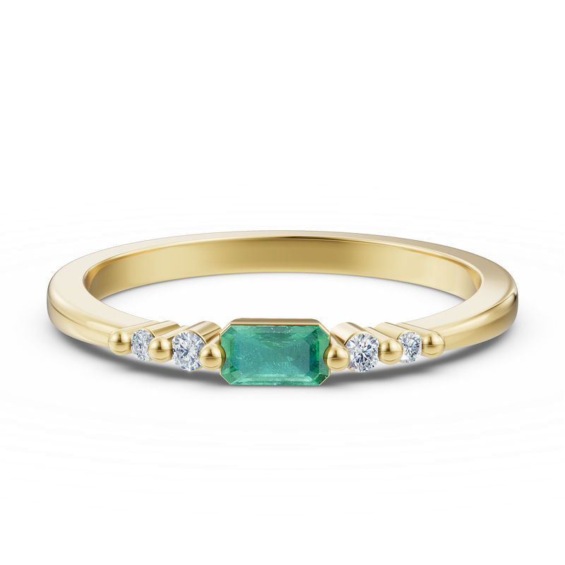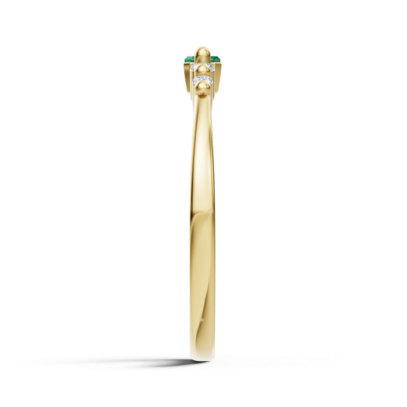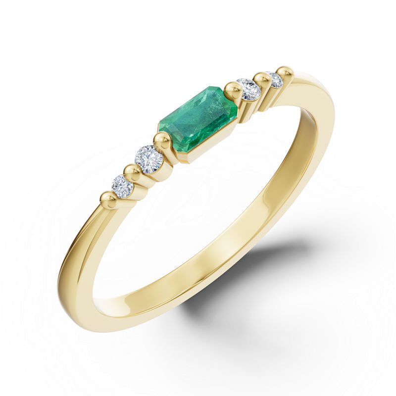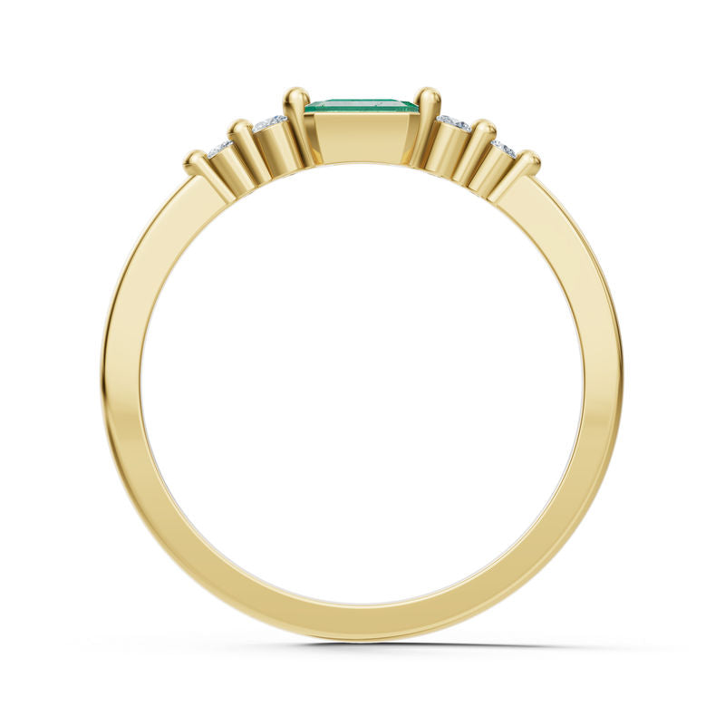 Elegantní a nadčasový prsten ze 14 karátového žlutého zlata spojuje moderní design s klasickou sofistikovaností. Středový smaragd ve smaragdovém brusu zaujme intenzivní zelenou barvou a je doplněn jemnými postranními diamanty kvality SI1, barvy G s excelentním brusem, které dodávají šperku třpyt a luxusní charakter. Celková hmotnost kamenů 0.166 ct podtrhuje jeho výjimečnost a nadčasovou eleganci. Lesklý povrch a čisté linie designu zvýrazňují precizní zpracování a krásu drahokamů, díky čemuž prsten působí lehce, elegantně a sofistikovaně. Uložen v luxusní dárkové krabičce a doplněn certifikátem pravosti, je perfektním doplňkem pro ženy, které chtějí vyniknout stylově a s jemným, nadčasovým šarmem.