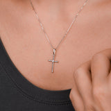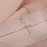 Luxusný prívesok v tvare krížika z bieleho 14 karátového zlata ozdobený žiarivým diamantom 0.015 ct okrúhleho brusu. Prívesok má snehovo biely lesklý povrch. Šperk je uložený v luxusnej darčekovej krabičke spolu s certifikátom pravosti.