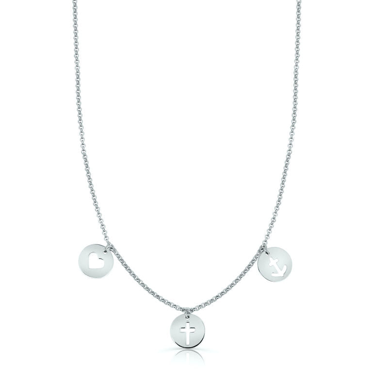 Kolekcia symbolických náhrdelníkov Láska, viera, nádej je stelesnením emócií a súčasného diania okolo nás. Tri prívesky placiek s vyrazenými tvarmi kotvičky, srdiečka a krížika sú vyrobené z bieleho 14 karátového zlata. Retiazka s dĺžkou 41 cm je súčasťou náhrdelníka a prívesky sú na ňom na pevno uchytené. Jedná sa o celozlatý šperk bez diamantov.