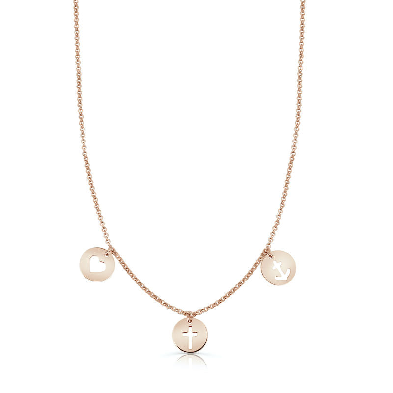 Kolekcia symbolických náhrdelníkov Láska, viera, nádej je stelesnením emócií a súčasného diania okolo nás. Tri prívesky placiek s vyrazenými tvarmi kotvičky, srdiečka a krížika sú vyrobené z ružového 14 karátového zlata. Retiazka s dĺžkou 41 cm je súčasťou náhrdelníka a prívesky sú na ňom na pevno uchytené. Jedná sa o celozlatý šperk bez diamantov.