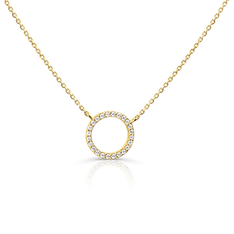 Luxusný okrúhly náhrdelník vyrobený zo 14-karátového žltého zlata a osadený trblietavými diamantmi okrúhleho brusu s celkovou hmotnosťou 0,096 ct. Šperk sa dodáva v luxusnej darčekovej krabičke spolu s certifikátom pravosti.
