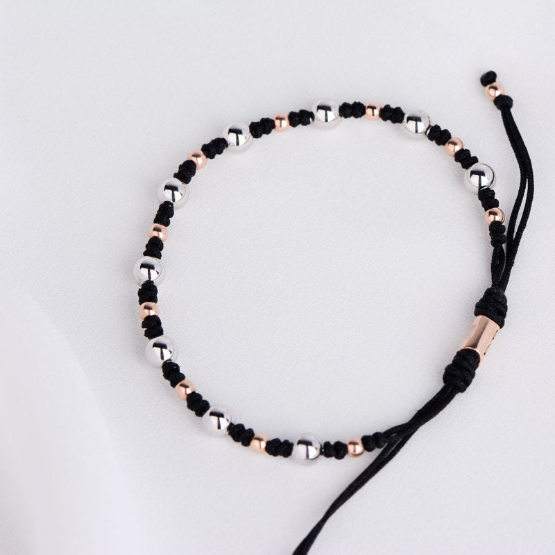 Dámsky šnúrkový náramok je tvorený střídajími sa komponenty celozlatých väčších a menších guľôčok s detailne spracovanými uzlíky. Zapínanie je riešené praktickým predlžovacím a skracovacím mechanizmom pre obvod zápästia od 15 do 20cm. Zlaté komponenty sú vyrobené z bieleho a ružového 14k 585/1000 zlata . Šnúrkový náramok nie je nutné dávať dole na šport ani kúpanie a dorazí uložený v luxusnej krabičke.