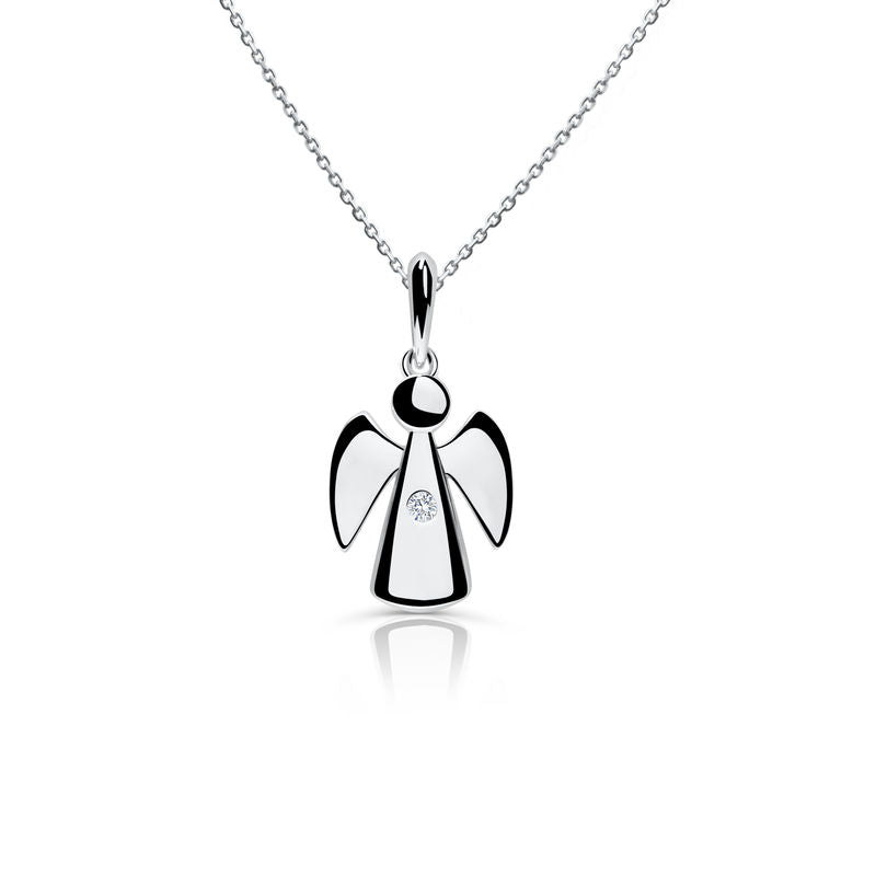 Luxusný prívesok v tvare anjela, ktorý sa považuje za symbol ochrany a lásky. Je vyrobený z bieleho 14-karátového zlata, ktoré dopĺňa trblietavý diamant s okrúhlym brusom a hmotnosťou 0,027 ct. Prívesok má lesklý povrch. Šperk je uložený v luxusnej darčekovej krabičke spolu s certifikátom pravosti.