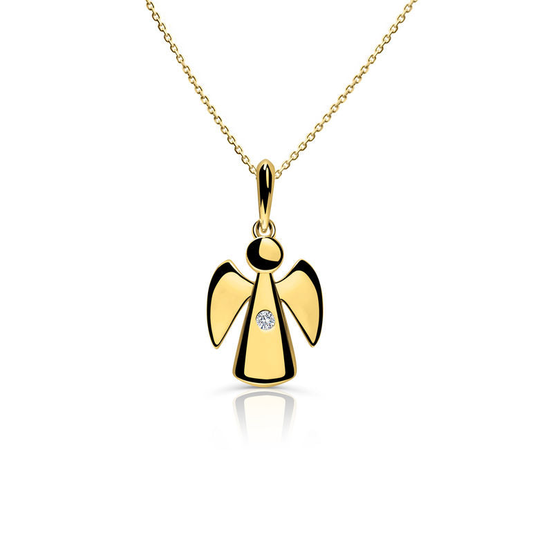 Luxusný prívesok v tvare anjela, ktorý sa považuje za symbol ochrany a lásky. Je vyrobený zo 14-karátového žltého zlata doplneného trblietavým diamantom s okrúhlym brusom a hmotnosťou 0,027 ct. Prívesok má lesklý povrch. Šperk je uložený v luxusnej darčekovej krabičke spolu s certifikátom pravosti.