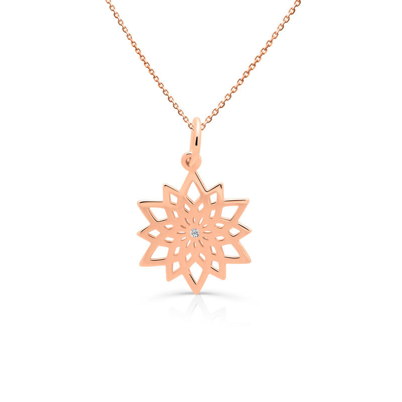 Luxusný prívesok v tvare mandaly z ružového 14 karátového zlata doplnený žiarivým diamantom 0.004 ct okrúhleho brusu. Prívesok má lesklý povrch. Šperk je uložený v luxusnej darčekovej krabičke spolu s certifikátom pravosti.