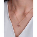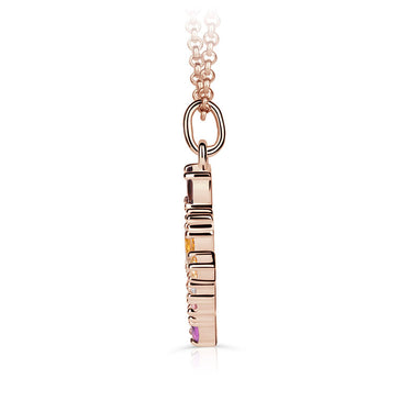 Dámsky zlatý prívesok s motívom písmená vyrobený z 14 karátového ružového zlata je osadený 18 drahokamami o celkovej váhe 0,729 ct. Kamene sú vybrúsené do tvaru oválu, slzy, kvapky, princess, markízy alebo briliantu. V písmene je zasadená originálne variácie farebných prírodných kameňov, ktorých detailné informácie nájdete v tabuľke nižšie - parametre šperku.