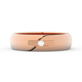 Jednoduchý a tradičný snubný prsteň, ktorý je vyrobený z kvalitného, 14-karátového, ružového zlata o celkovej hmotnosti 5,4 g (orientačná váha). Šírka prsteňa je 4,70 mm. Prsteň má pologuľatý profil, patrí do kolekcie Basic, v ktorej sú prstene vyrábané tradičnou metódou valcovania a vyznačujú sa veľmi prijateľnými cenami. Prsteň je osadený jedným diamantom okrúhleho brusu s hmotnosťou 0,02ct. Briliant je hladko zapustený vo vodorovnej drážke v strede prsteňa.