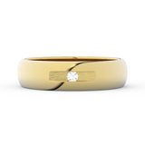 Jednoduchý a tradičný snubný prsteň, ktorý je vyrobený z kvalitného, 14-karátového, žltého zlata o celkovej hmotnosti 5,4 g (orientačná váha). Šírka prsteňa je 4,70 mm. Prsteň má polguľatý profil, patrí do kolekcie Basic, v ktorej sú prstene vyrábané tradičnou metódou valcovania a vyznačujú sa veľmi prijateľnými cenami. Prsteň je osadený jedným diamantom okrúhleho brusu s hmotnosťou 0,02ct. Briliant je hladko zapustený vo vodorovnej drážke v strede prsteňa.