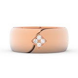 Jednoduchý a tradičný snubný prsteň, ktorý je vyrobený z kvalitného, 14-karátového, ružového zlata o celkovej hmotnosti 6,7 g (orientačná váha). Šírka prsteňa je 7,5mm. Prsteň má pologuľatý profil, patrí do kolekcie Basic, v ktorej sú prstene vyrábané tradičnou metódou valcovania a vyznačujú sa veľmi prijateľnými cenami. Prsteň je osadený štyrmi diamantmi okrúhleho brusu s hmotnosťou 0,02ct. Brilianty sú v prsteni usadené v drobných zlatých zrnkách do tvaru kosoštvorca.