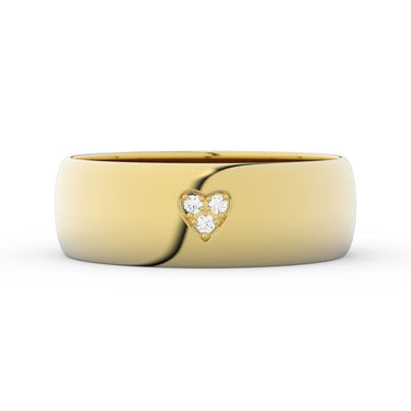 Jednoduchý a tradičný snubný prsteň, ktorý je vyrobený z kvalitného, 14-karátového, žltého zlata o celkovej hmotnosti 4,9 g (orientačná váha). Šírka prsteňa je 6mm. Prsteň má pologuľatý profil, patrí do kolekcie Basic, v ktorej sú prstene vyrábané tradičnou metódou valcovania a vyznačujú sa veľmi prijateľnými cenami. Prsteň je osadený tromi diamantmi okrúhleho brusu s hmotnosťou 0,027ct. Brilianty usadené v zlatých zrnkách tvoria v prsteni tvar srdca.