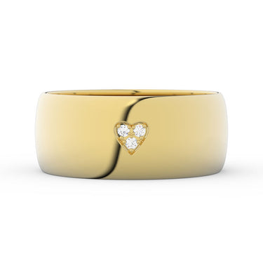 Jednoduchý a tradičný snubný prsteň, ktorý je vyrobený z kvalitného, 14-karátového, žltého zlata o celkovej hmotnosti 6,5 g (orientačná váha). Šírka prsteňa je 7,5mm. Prsteň má polguľatý profil, patrí do kolekcie Basic, v ktorej sú prstene vyrábané tradičnou metódou valcovania a vyznačujú sa veľmi prijateľnými cenami. Prsteň je osadený tromi diamantmi okrúhleho brusu s hmotnosťou 0,027ct. Brilianty usadené v zlatých zrnkách tvoria v prsteni tvar srdca.
