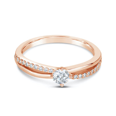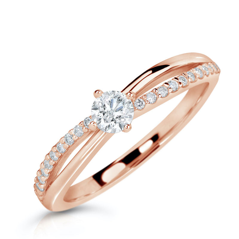 Luxusní zásnubní prsten z kolekce Danfil Diamonds vyrobený z růžového 14 karátového zlata s krásným středovým diamantem kulatého brusu o váze 0.203 ct zvýrazněný 22 bočními brilianty o váze 0.088 ct. Celkový počet karátů ve šperku je 0.291 ct. Prsten má lesklý povrch. Šperk je uložen v luxusní dárkové krabičce spolu s certifikátem pravosti.