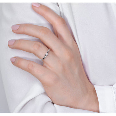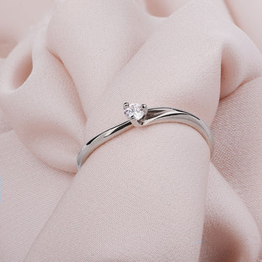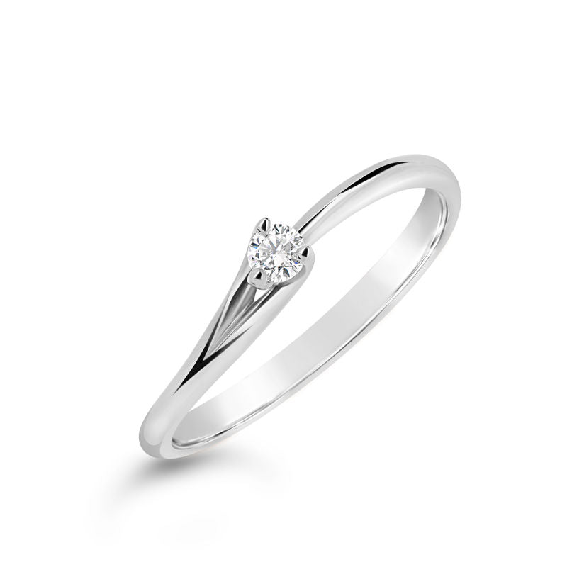Krásný zásnubní prsten z kolekce Danfil Diamonds vyrobený z bílého 14 karátového zlata s třpytivým středovým briliantem kulatého brusu o váze 0.083 ct. Prsten má sněhově bílý lesklý povrch. Šperk je uložen v luxusní dárkové krabičce spolu s certifikátem pravosti.